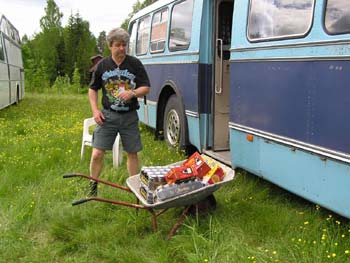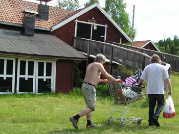 ![]() Redan tidigt på förmiddagen kom Norrlänningarna. ![]() Bagladies? Nej det är förberedelserna som dragit igång och en kundvagn från lanthandeln är perfekt att dra runt saker i. Lite större hjul hade ju inte skadat förstås. ![]() Skottkärran fick oxå jobba. Många vändor upp på logen blev det. ![]() Det började bli varmt så lite paus fick det bli.