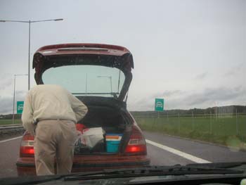 ![]() På förmiddagen började folk att ge sig av hemåt. Dags för Norrlandsgänget att fara iväg. Ska bara vända först. ![]() Vädret var inget vidare idag. Bilden tagen på samma ställe som bild nr 3 den 20/5, fast åt andra hållet :-) ![]() Lite blåsigt och kyligt, men.. ![]() Kulglass är aldrig fel. Den där illgröna kulan är Maskros/Fläder.. ![]() Ungarna var en anings avslagna efter helgen. ![]() Efter en stunds vila åkte vi vidare. ![]() I Björneborg skulle vi hälsa på hos Donald och Monica. Men dom var inte hemma så vi fick vända. ![]() Snacka om minipris. 50öre/liter. Synd att X betyder 10. ![]() Blev ett MC Donalds-stopp i Kristinehamn. Är en anings trött på den maten nu ![]() Ooops! Vad står i Örebro då? Får bli en egen liten sida med denna och ett par till. För ni tror väl inte att jag bara tog ett kort? (till ungarnas förtret. - Vi vill heeeem...) ![]() Nånting orsake tvärstopp precis när vi passerat Västerås. Två saker man brukar bli i kö är ju kissnödig och hungrig. Denna man gick och hämtade matsäcken så vi var tvugna att göra detsamma. ![]() Efter ca 30 min kom vi fram till ett ställe vi kunde vända på. Vi var inte ensamma om att snirkla runt på småvägarna. Ingen verkade veta riktigt heller vart vi var på väg. ![]() Men till slut kom vi ut på E18 i höjd med Enköping. |